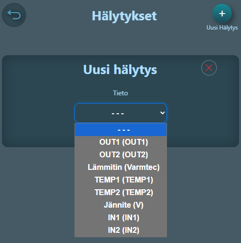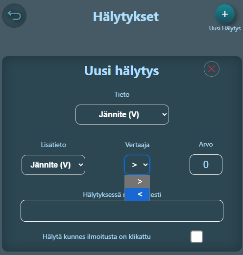 Voit nyt valita vertaajan, eli annetaanko hälytys kun Jännite on isompi vai pienempi kuin "Arvo"