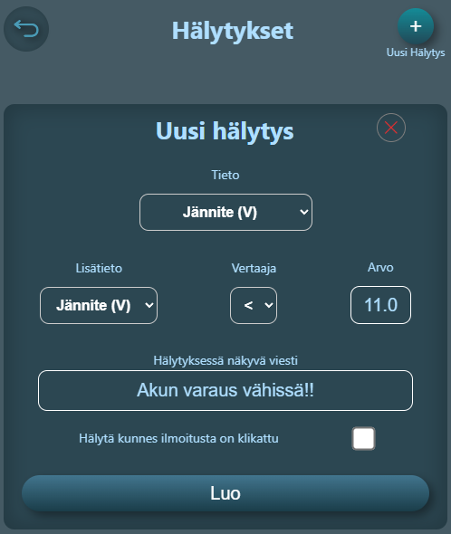 Luo uusi hälytys "Uusi Hälytys" painikkeella